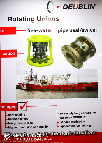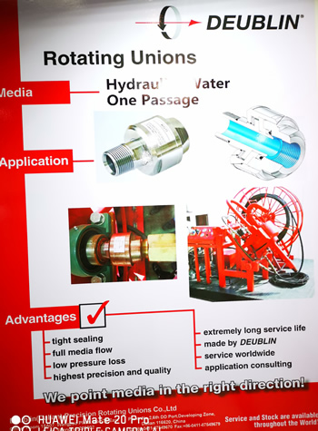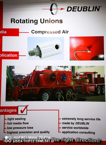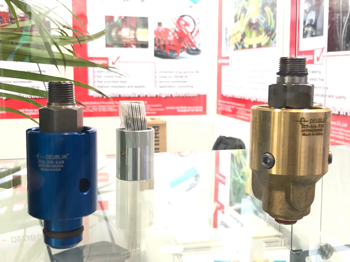 DEUBLIN公司攜新產品亮相展會,包括:石油頂驅配套旋轉接頭;連續油管車配套多通道旋轉接頭;石油壓裂泵和泥漿泵配套旋轉接頭;動力水龍頭配套高壓旋轉接頭;用于車載石油鉆機鉆塔設備以及制動和開動鉆井平臺的鼓形剎車系統的雙通道旋轉接頭。