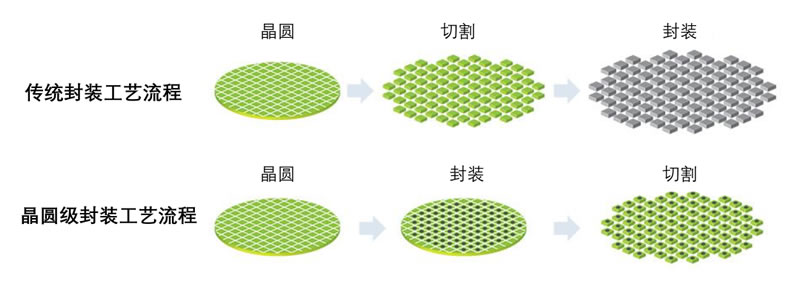 傳統(tǒng)封裝需要將每個芯片都從晶圓中切割出來并放入模具中。 晶圓級封裝(WLP)則是先進(jìn)封裝技術(shù)的一種, 是指直接封裝仍在晶圓上的芯片。 WLP的流程是先封裝測試,然后一次性將所有已成型的芯片從晶圓上分離出來。與傳統(tǒng)封裝相比, WLP的優(yōu)勢在于更低的生產(chǎn)成本。