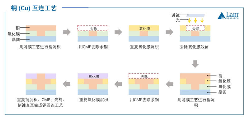 隨著銅原子不斷擴(kuò)散至電介質(zhì),后者的絕緣性會降低并產(chǎn)生阻擋銅原子繼續(xù)擴(kuò)散的阻擋層。之后阻擋層上會形成很薄的銅種子層。到這一步之后就可以進(jìn)行電鍍,也就是用銅填充高深寬比的圖形。填充后多余的銅可以用金屬化學(xué)機(jī)械拋光 (CMP) 方法去除,完成后即可沉積氧化膜,多余的膜則用光刻和刻蝕工藝去除即可。前述整個過程需要不斷重復(fù)直至完成銅互連為止。