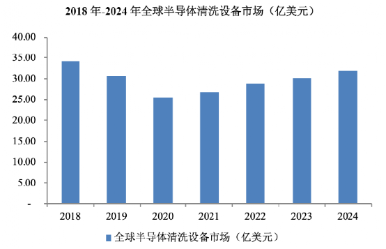 根據Gartner統計數據,2018年全球半導體清洗設備市場規模為34.17億美元,2019年和2020年受到全球半導體行業景氣下降的影響有所下行,分別為30.49億美元和25.39億美元,預計2021年后隨著全球半導體行業復蘇,半導體清洗設備市場會逐年增長,預計2024年達到近32億美元。