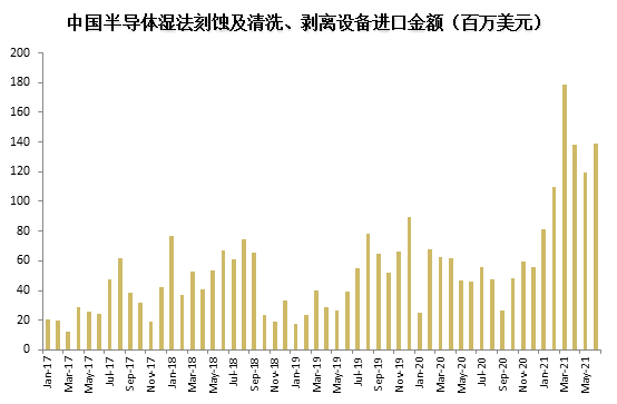 海關數據顯示,2020年中國半導體濕法刻蝕及清洗、剝離設備的進口額已經突破6億美元,進口金額仍然不小。目前中國大陸的清洗設備領域主要由盛美半導體、北方華創、芯源微、至純科技四家廠商。其中,盛美半導體主要產品為集成電路領域的單片清洗設備,產品線較為豐富;北方華創收購美國半導體設備生產商Akrion Systems LLC之后,主要產品為單片及槽式清洗設備;芯源微目前產品主要應用于集成電路制造領域的單片式刷洗領域;至純科技具備生產8-12英寸高階單晶圓濕法設備和槽式濕法清洗設備的相關技術。
