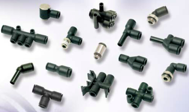 Connection of tubing at a 90° angle to a push-in fitting or cartridge. Useful