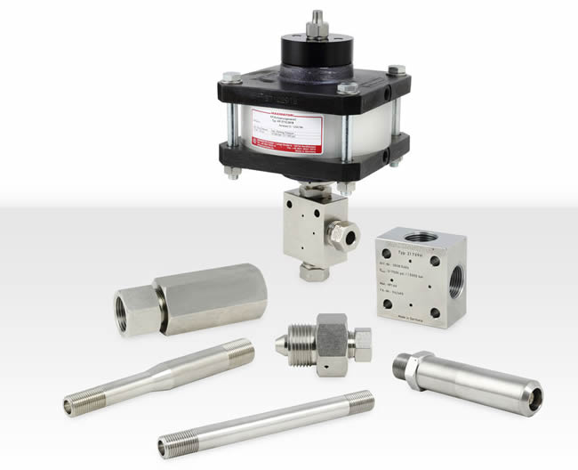 Maximator offers a complete line of pneumatic actuated high pressure needle valves, fittings, tubing, check valves, adapters and couplings as well as accessories for High Pressure Applications up to 217,000 psi(15,000 bar).