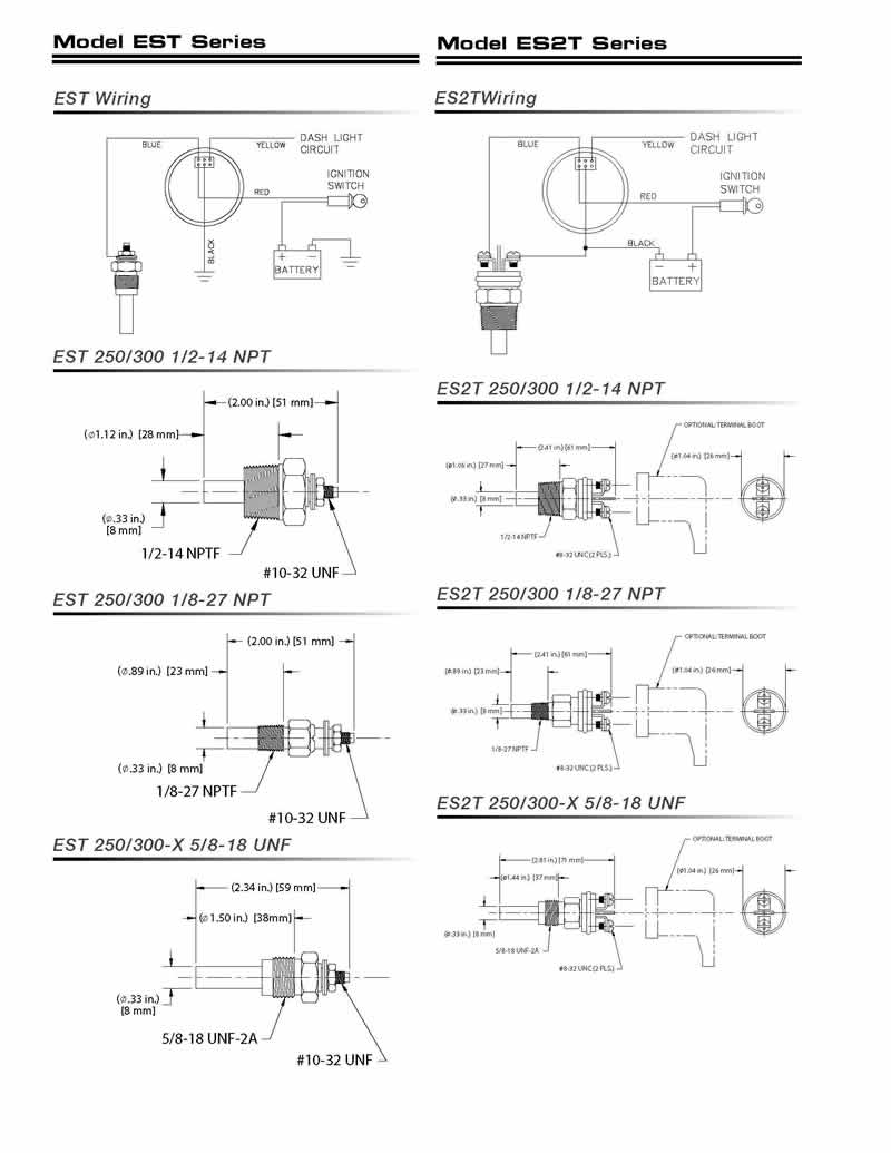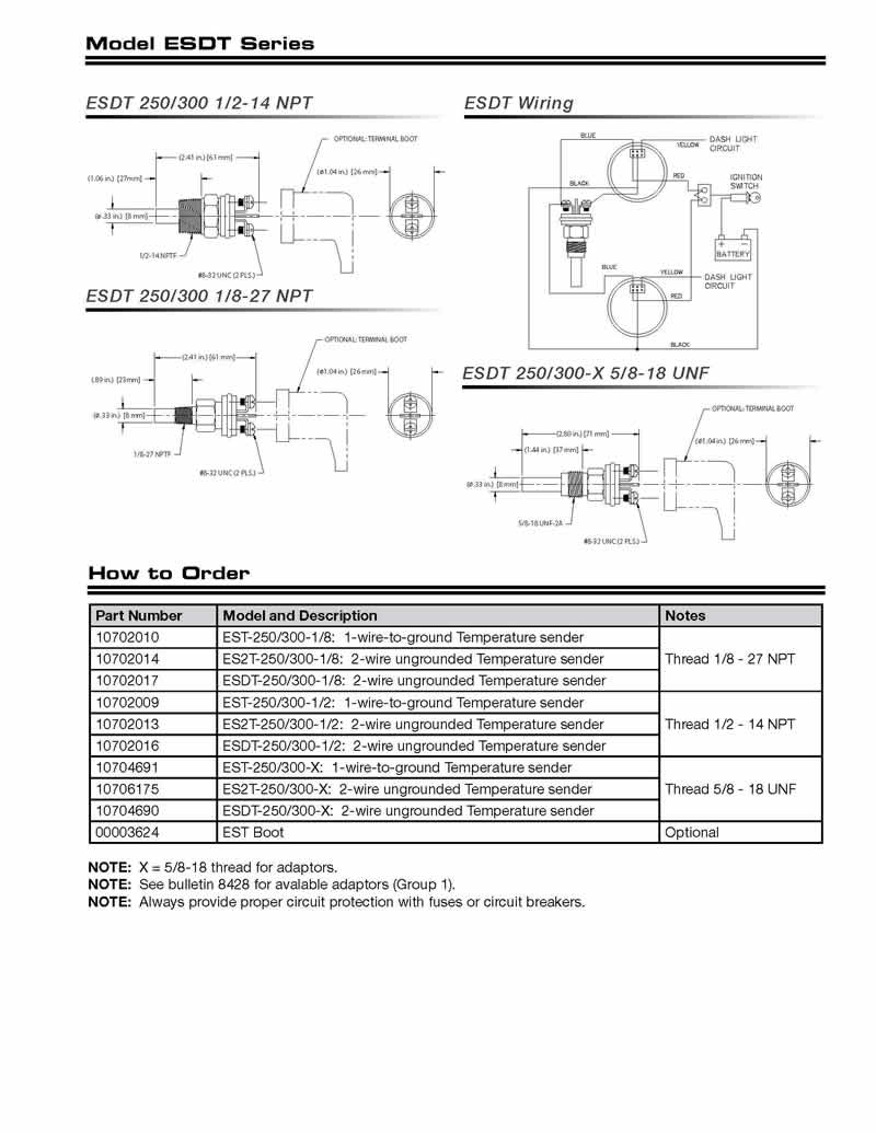 Part Number 10702010 10702014 10702017 10702009 10702013 10702016 10704691 10706175 10704690 00003624 Model and Description EST-250/300-1/8: 1-wire-to-ground Temperature sender ES2T-250/300-1/8: 2-wire ungrounded Temperature sender ESDT-250/300-1/8: 2-wire ungrounded Temperature sender EST-250/300-1/2: 1-wire-to-ground Temperature sender ES2T-250/300-1/2: 2-wire ungrounded Temperature sender ESDT-250/300-1/2: 2-wire ungrounded Temperature sender EST-250/300-X: 1-wire-to-ground Temperature sender ES2T-250/300-X: 2-wire ungrounded Temperature sender ESDT-250/300-X: 2-wire ungrounded Temperature sender EST Boot Notes Thread 1/8 - 27 NPT Thread 1/2 - 14 NPT Thread 5/8 - 18 UNF Optional