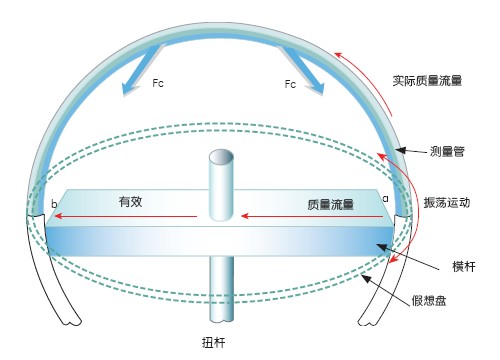 圓盤振蕩產生的科里奧利力("FC") 及有效質量流量向量與跨過圓盤的實際質量流量的運動垂直,與質量流量成正比。流量計中,這個力產生了兩個傳感線圈感應到的偏轉。