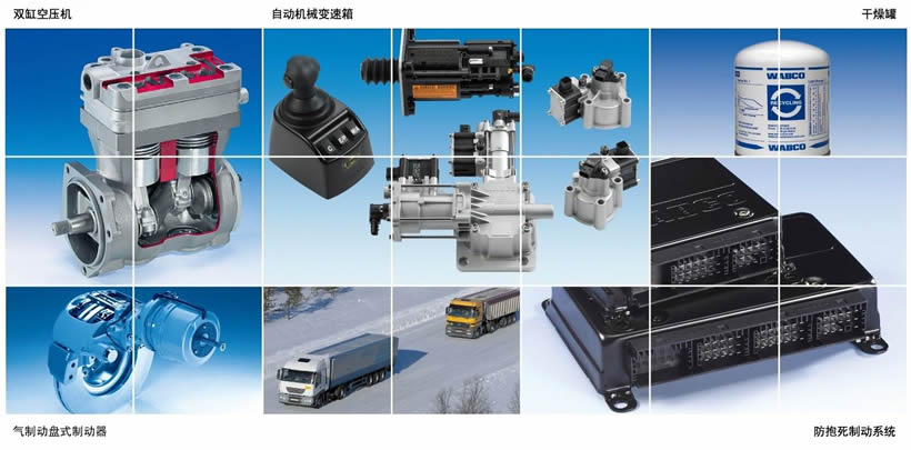 主要包括空氣處理系統(tǒng)、卡車和客車的制動(dòng)系統(tǒng)、傳動(dòng)控制系統(tǒng)、電子控制系統(tǒng)、制動(dòng)器和制動(dòng)室、掛車控制系統(tǒng)、商用車空氣懸掛和轎車系統(tǒng)。