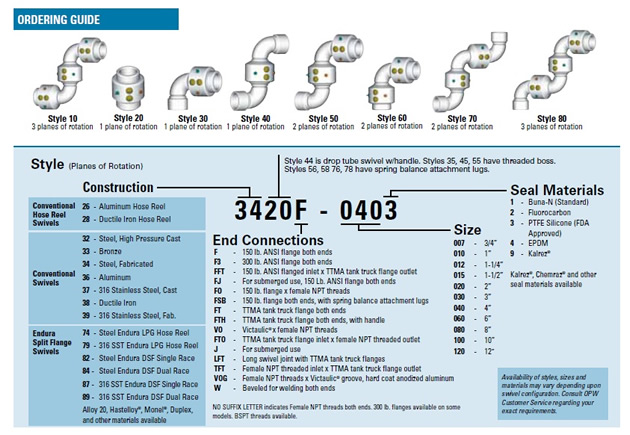 所有OPW旋轉接頭都是全通徑系列號為40帶短半徑彎管結構,除了6"、8"和10"結構鋼和不銹鋼旋轉接頭是長半徑彎管。所有旋轉接頭 的球軸承滾道和密封面都是精密機加工和微處理的,確保無磨損操作和優秀密封特性。所有鋼和球墨鑄鐵旋轉接頭都涂藍漆。詳細系列