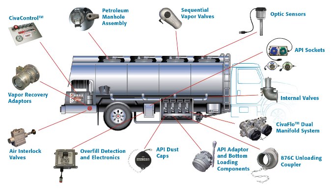 50年多年來,當提及安全處理和運輸危險性液體時,Civacon罐車和運輸組件和系統的可靠性、耐久性和優越的性能已為知曉。主要罐車和運輸工具建造者指定使用本公司的人孔組件、串聯油氣閥、滿溢檢測設備、內部閥、裝卸組件、以及本公司的商標制度和3個總儲車系統,以確保人員安全和環境免受石油和化學品泄漏、儲罐滿溢和易散性排放的影響。本公司創新型模塊化歧管和空氣控制系統提高了燃料輸送的有利性、準確性和簡易性。Civacon設置了可靠性、高質量性、兼容性、性能條件的通用標準。