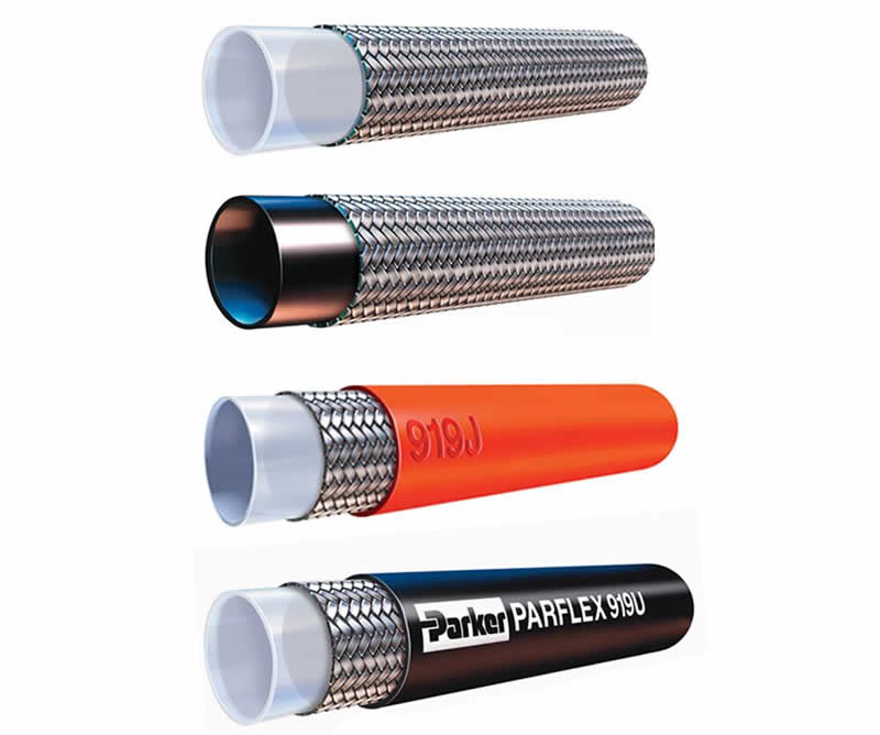 Parker's Chemical Resistant PTFE Smoothbore hoses have exceptional chemical compatibility and handle temperatures as high as +450°F. 919/919B assemblies are used in numerous applications including, but not limited to, chemical transfer lines, high temperature general hydraulics, and coolant lines. The PTFE core tube resists moisture and offers the lowest coefficient of friction of any known plastic, therefore minimizing pressure drops and deposits. PTFE hoses are less susceptible to cracking from stress or flexing than metal hoses. The 919 hose meets SAE 100R14A and is constructed of a natural FDA compliant PTFE tube while 919B hose meets SAE 100R14B and is manufactured with a black static-dissipating PTFE core tube. Parker 919B should be used when conveying non-conducting fluids such as oils, paints, fuels, or steam. Parker’s 919J PTFE Hose features an extruded silicone jacket to provide a clean, smooth cover and 919U features a non-marring, abrasion-resistant polyurethane jacket to shield the stainless steel wire reinforcement against wear, fraying and contaminants. Both of these hoses are constructed of a natural FDA compliant PTFE core tube and reinforced with a 304 stainless steel braid. The polyurethane jacket on the 919U hoses reduces the minimum and maximum temperature range (-40°F to +275°F). The silicone jacket on the 919J PTFE hose only reduces the lower operating temperature (-40°F to +450°).