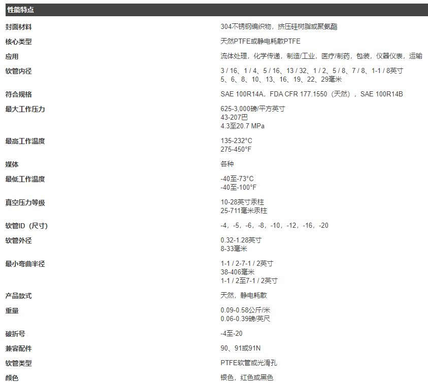 內胎:919 –符合FDA的天然PTFE | 919B –黑色防靜電PTFE增強材料:304不銹鋼編織層
