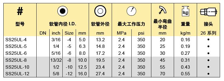 Parker SS25UL系列LPG用軟管產(chǎn)品選型表格