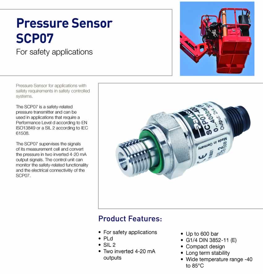 Parker派克 SensoControl SCP07壓力傳感器,可用于滿足EN ISO13849標準D級或IEC 61508標準要求的SIL 2等的應用場合。SensoControl SCP07壓力傳感器,可用于滿足EN ISO13849標準D級或IEC 61508標準要求的SIL 2等的應用場合。壓力傳感器SensoControl SCP07能被使用于多種應用場合,通常在這些應用中都會要求符合EN ISO13849標準的D等或者IEC 61508標準的SIL2性能要求。