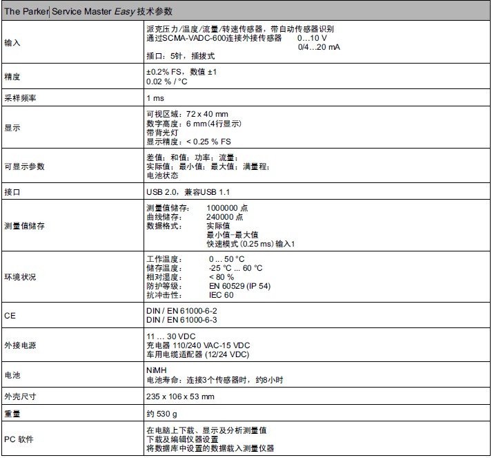 Parker Service Master Easy是一款多通道手持式儀器,可同時(shí)測(cè)量、顯示、儲(chǔ)存和處理多種液壓參數(shù),如壓力、壓差、流量、溫度和功率等。