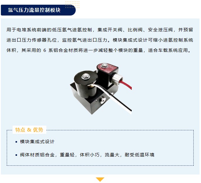 用于電堆系統前端的低壓氫氣進氫控制,集成開關閥、比例閥、安全泄壓閥,并預留進出口壓力傳感器孔位,監控氫氣進出口壓力。模塊集成式設計可縮小進氫控制系統體積,其采用的 6 系鋁合金材質將進一步減輕整個模塊的重量,適合車載系統應用。