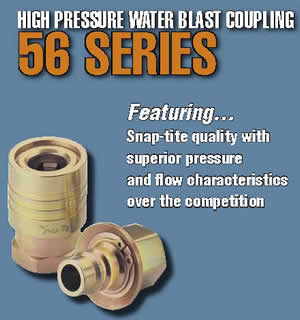 56 Series - Snap-tite's 56 Series couplings are designed for rugged, high pressure water blasting equipment used in cleaning applications to 12,000 psi (828 bar). In addition to paint removal, water blast equipment is used in the cleaning of maritime vessels and equipment as well as the removal of mill scale. The 56 Series interchanges with Parker WB and Aeroquip FD69 Series units.
