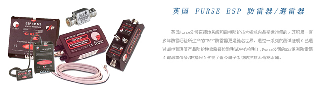 英國Furse公司在接地系統和雷電防護技術領域內是好的,其積累一百多年防雷經驗所生產的"ESP"防雷器更是優秀。Furse是一家接地和防雷產品制造商。憑借著廣泛的接地材料、瞬態過電壓/電涌保護器和熱熔焊設備,Furse可提供整體解決方案,以符合接地保護和防雷要求。通過一系列的測試證明(已通過郵電部通信產品防護性能監督檢驗測試中心檢測),Furse公司的ESP系列防雷器(電源和信號/數據線)代表了當今電子系統防護技術高水準。"ESP"全系列產品均取得了許多國家標準和相關國際標準的認證:L467、EC1024、BS6651、BS7430、CE、CCITT等。在國內,ESP防雷器已在民航、銀行、海關、郵電、移動通信、地震局、廣電局等部門廣泛使用,而且防雷效果顯著。