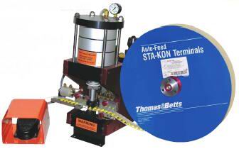 12050 Compact, pneumatically operated unit for crimping tape-mounted Sta-Kon? terminals; equipped with Shure-Stake mechanism, which ensures a full compression each time