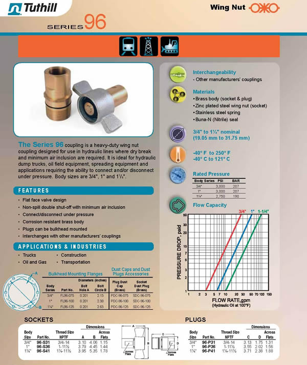 Hansen Series 96 is a heavy-duty wing nut coupling designed for use in hydraulic lines where dry break and minimum air inclusion are required. It is a connect / disconnect under pressure coupling. Body sizes are 3/4”, 1" and 1”1/4 and the materials are in brass and steel for corrosion resistance and durability. The working pressure is up to 200 bar / 3,000 psi. These couplings are used in many hydraulic applications in the Oil & Gas industry